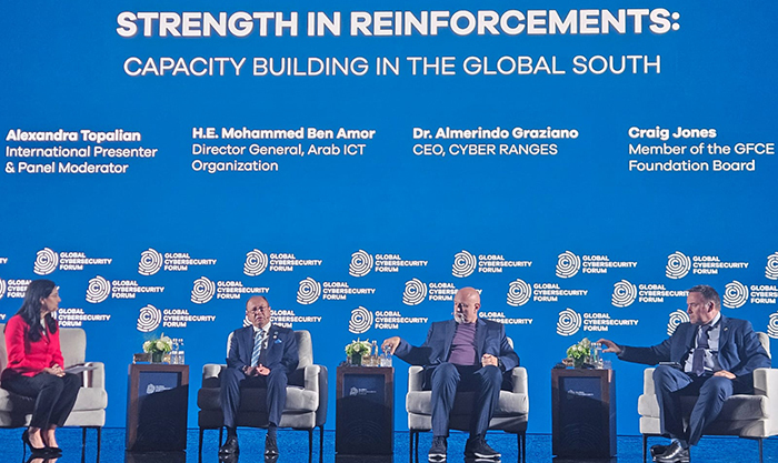 Speaking alongside global leaders, HE. Eng. Ben Amor underscored the critical role of regional and international organizations in strengthening global cybersecurity resilience and shaping the ethical adoption of emerging technologies. He stressed the importance of cooperation through platforms like AICTO and the Council of Arab Ministers Responsible for Cybersecurity to harmonize policies, strengthen capacity building, and share best practices, while also highlighting the complementary role of organizations such as the ITU and UNDP. Addressing the dual impact of Artificial Intelligence, he called for ethical governance, training, and collaboration to maximize its benefits while mitigating risks. HE. Eng. Ben Amor also showcased AICTO’s leadership in the Arab region through the Arab Cybersecurity Strategy, regional CERTs, knowledge-sharing platforms, and the Arab AI Ethical Charter, reaffirming that regional collaboration is key to strengthening both Arab and global digital resilience.
