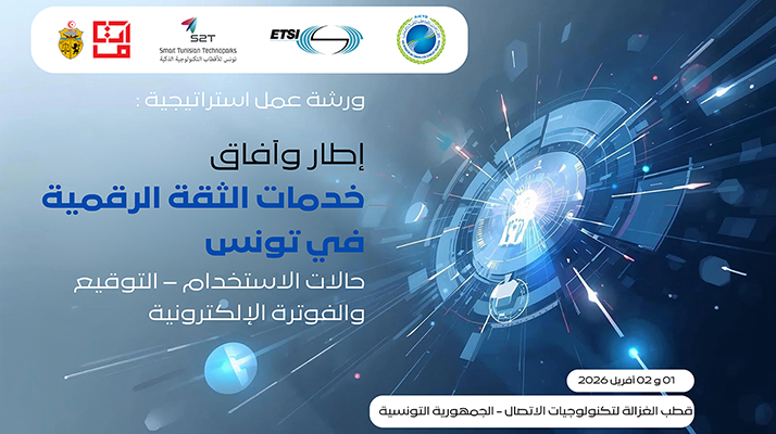 في إطار تنفيذ برنامج المنظمة العربية لتكنولوجيات الاتصال والمعلومات الرامي إلى تعزيز قدرات الدول العربية في مجال خدمات الثقة الرقمية، ولا سيما من خلال مشروع الشبكة العربية لهيئات التصديق الإلكتروني، تنظم المنظمة، بالتعاون مع وزارة تكنولوجيات الاتصال بالجمهورية التونسية والمعهد الأوروبي لمعايير الاتصالات (ETSI)، ورشة عمل استراتيجية بعنوان:
